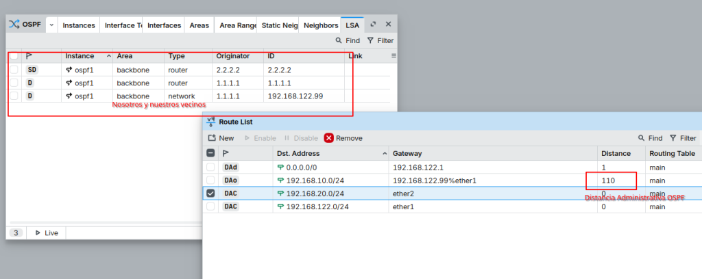 En Mikrotik también podemos ver las rutas aprendidas y nuestros vecinos.