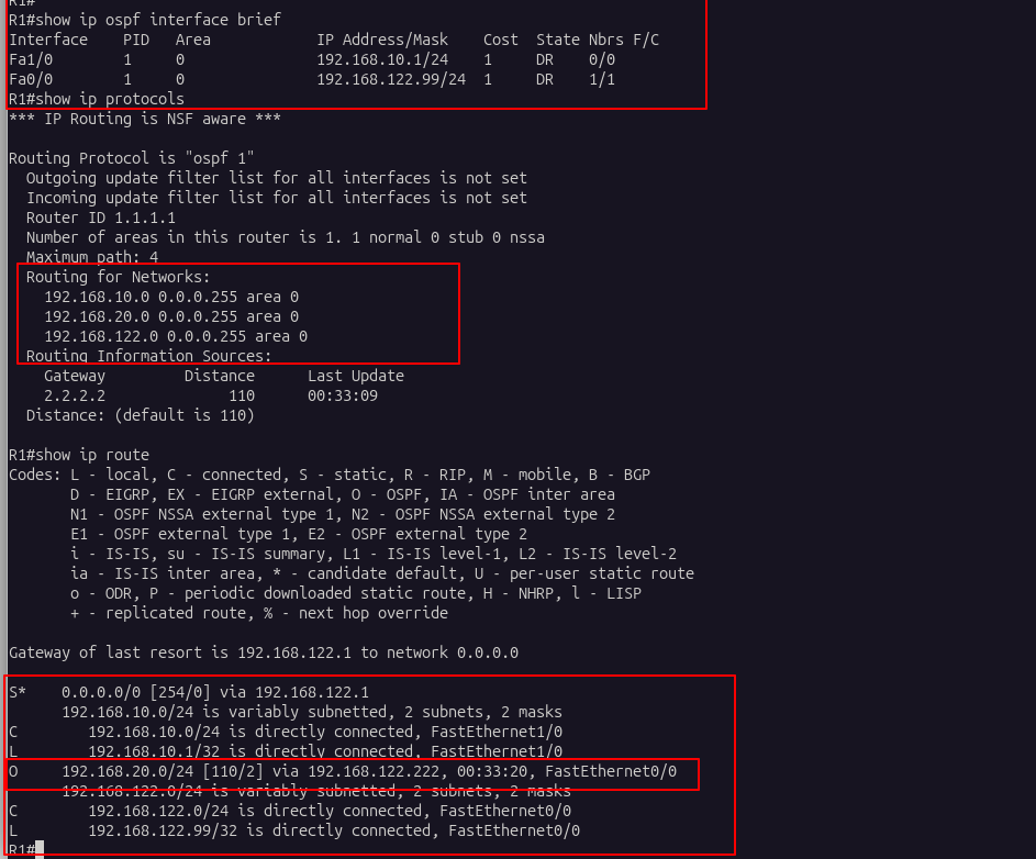Después de ejecutar algunos comandos podemos ver las interfaces dónde estamos propagando ospf, las rutas que recibimos y las que declaramos.