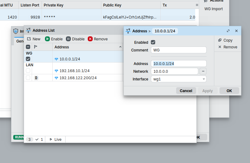 add address=10.0.0.3/24 comment=WG interface=wireguard1 network=10.0.0.0