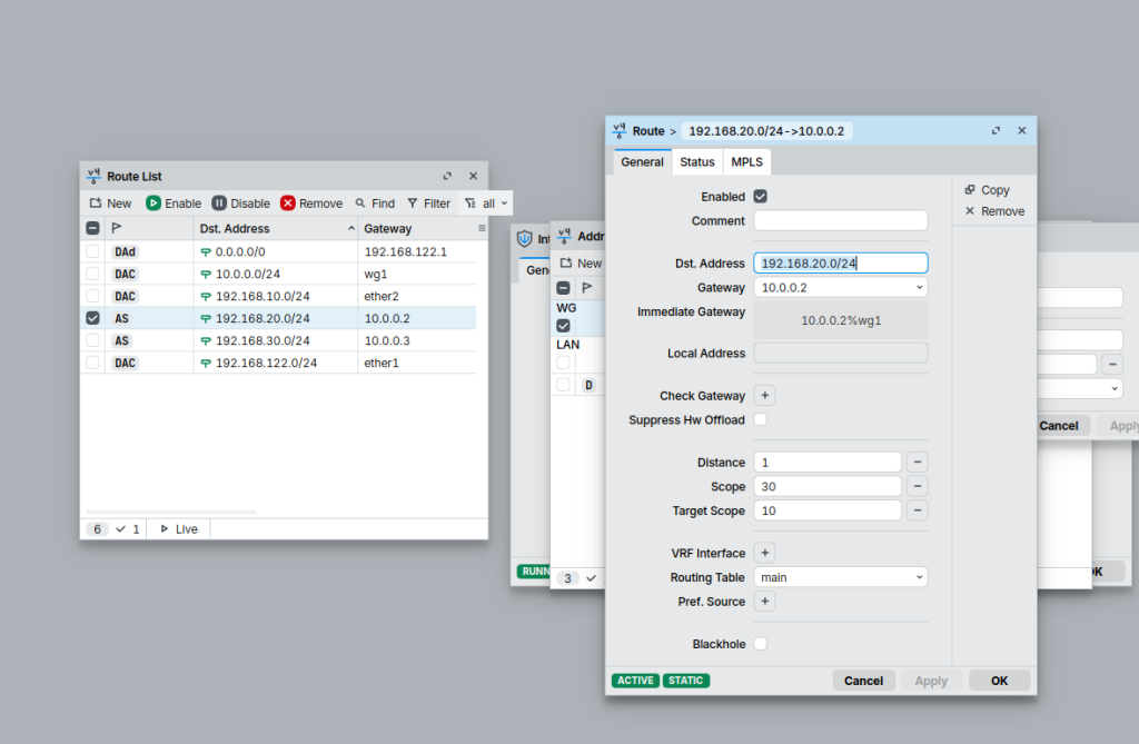 add address=10.0.0.2/24 comment=WG interface=wg1 network=10.0.0.0